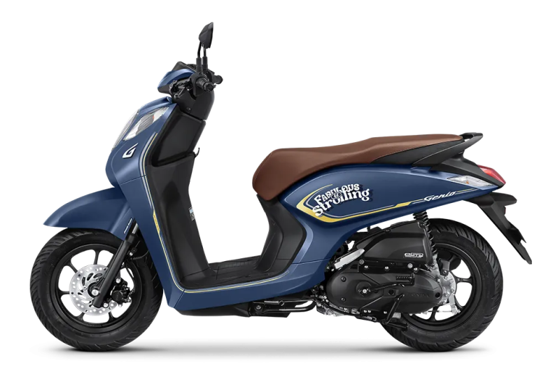Tampilan samping Honda Genio didominasi garis-garis tegas dan lekukan lembut yang menambah kesan dinamis. Motor ini memiliki tampilan yang simpel dan bersih, tanpa banyak aksen berlebihan, sehingga cocok untuk berbagai gaya berkendara. Warna-warna yang tersedia seperti merah, kuning, putih, dan hitam memberikan pilihan sesuai selera dan kepribadian pengguna. Kombinasi warna dan grafis yang modern membuat motor ini tetap terlihat segar dan menarik di jalan.